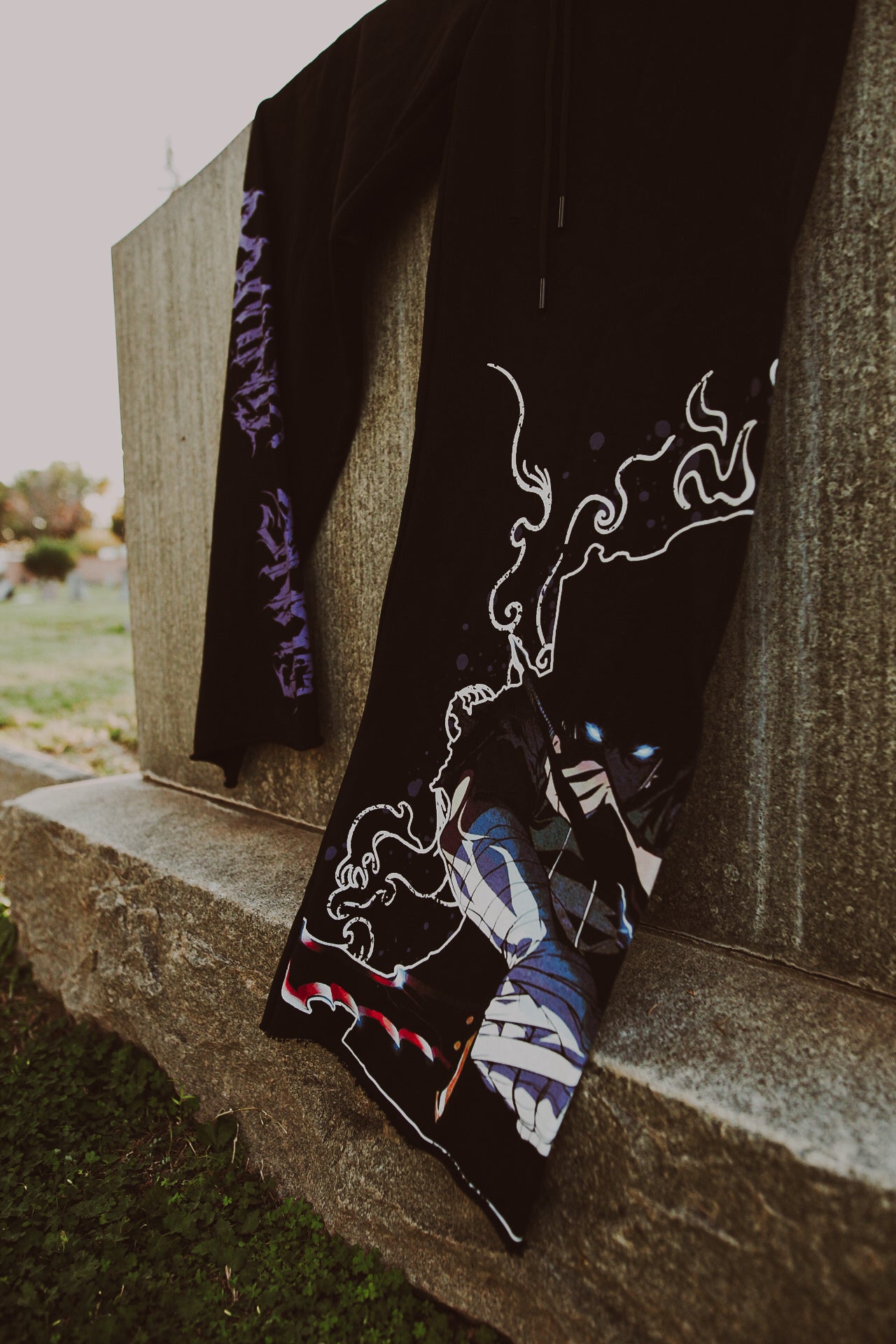 Design: Features raw edges and distressing for a rugged, unfinished feel. Graphic print inspired by Solo Leveling’s Sung Jinwoo.